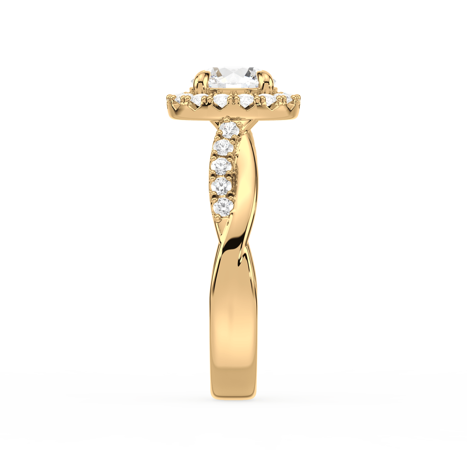 This ring showcases a round brilliant-cut center diamond| encircled by a halo of smaller diamonds. The halo design enhances the brilliance of the center stone| creating a striking and elegant look. The band’s unique design adds to the ring’s overall aesthetic appeal.