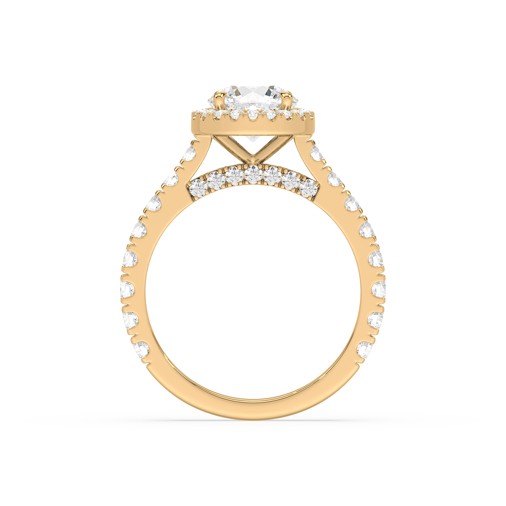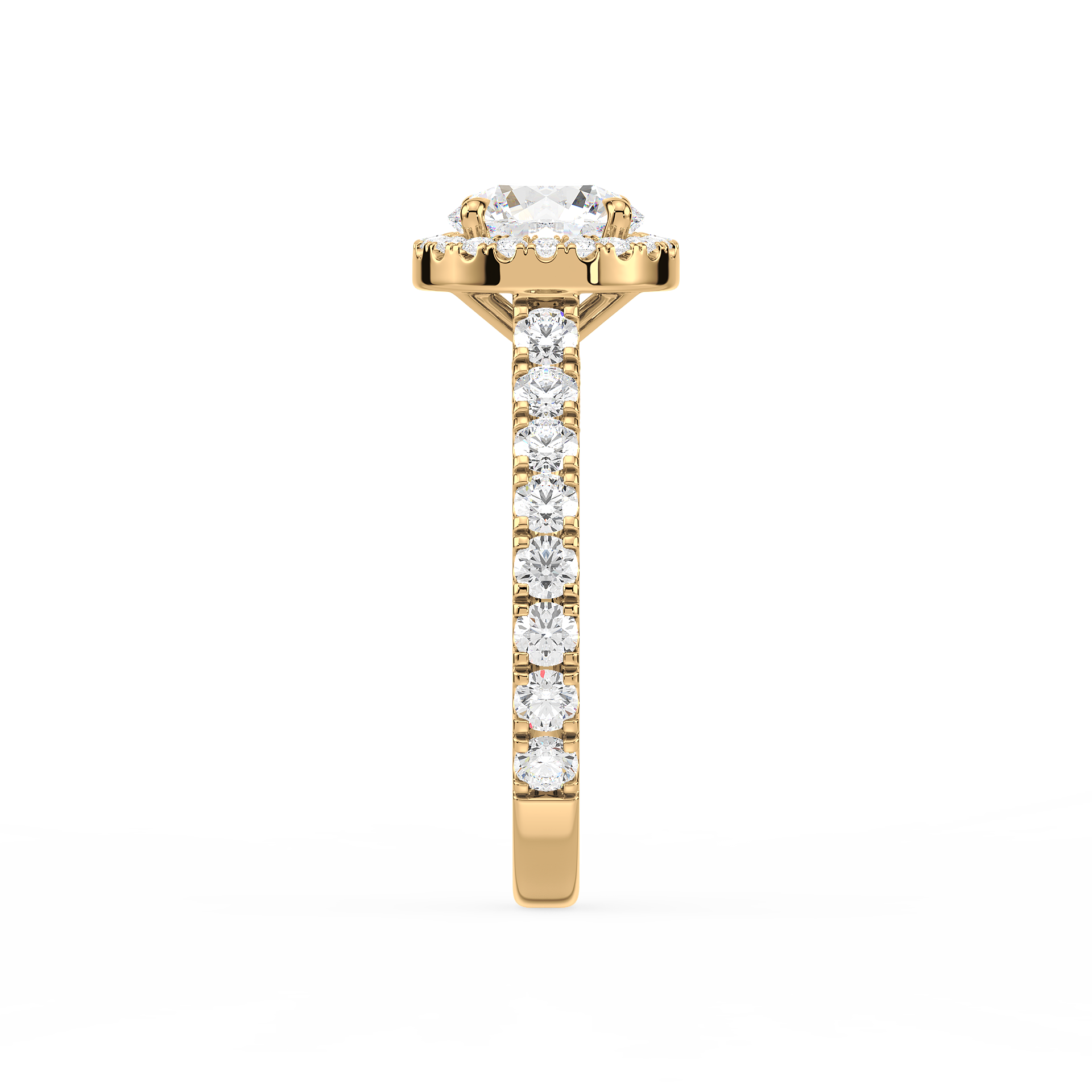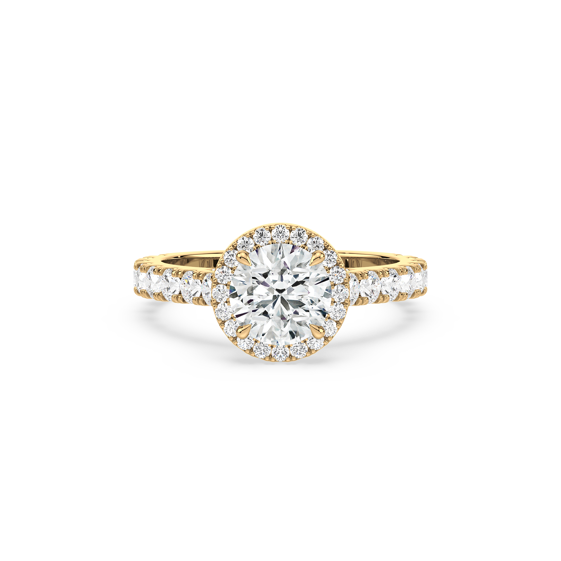 This beautiful Round Diamond Halo Engagement Ring is a wonderful reminder of your love. round-shaped diamond glistening in a single diamond halo. Additional diamonds shimmer along the shank. this engagement ring is a beautiful choice for your beloved.